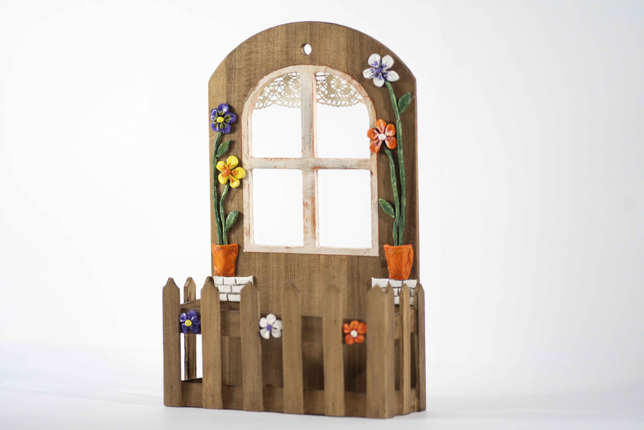 Peça artesanal feito com cartão, arame, folha de alumínio e tecidos. Aplicado em fundo a imitar parede de tijolo.